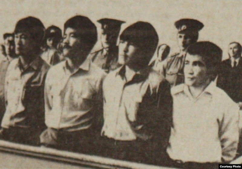 Солдан оңға қарай: Е.Көпесбаев, Т.Тәшенов, Қ.Рысқұлбеков және К.Күзембаев өздеріне шығарылған сот үкімін тыңдап тұр. Алматы, 16 маусым 1987 жыл. Советтік ҚазТАГ тілшісі Юрий Беккер түсірген сурет.