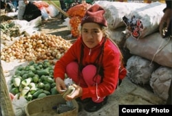 Умида Ахмедованың «Әйелдер мен ерлер: таң атқаннан күн батқанға дейін» атты фотоальбомындағы сатушы қыздың суреті.