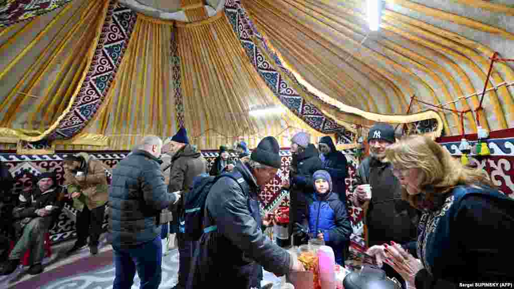 Қазақстаннан келген еріктілер киіз үй қонақтарына бауырсақ пен ыстық шай ұсынып жатыр.