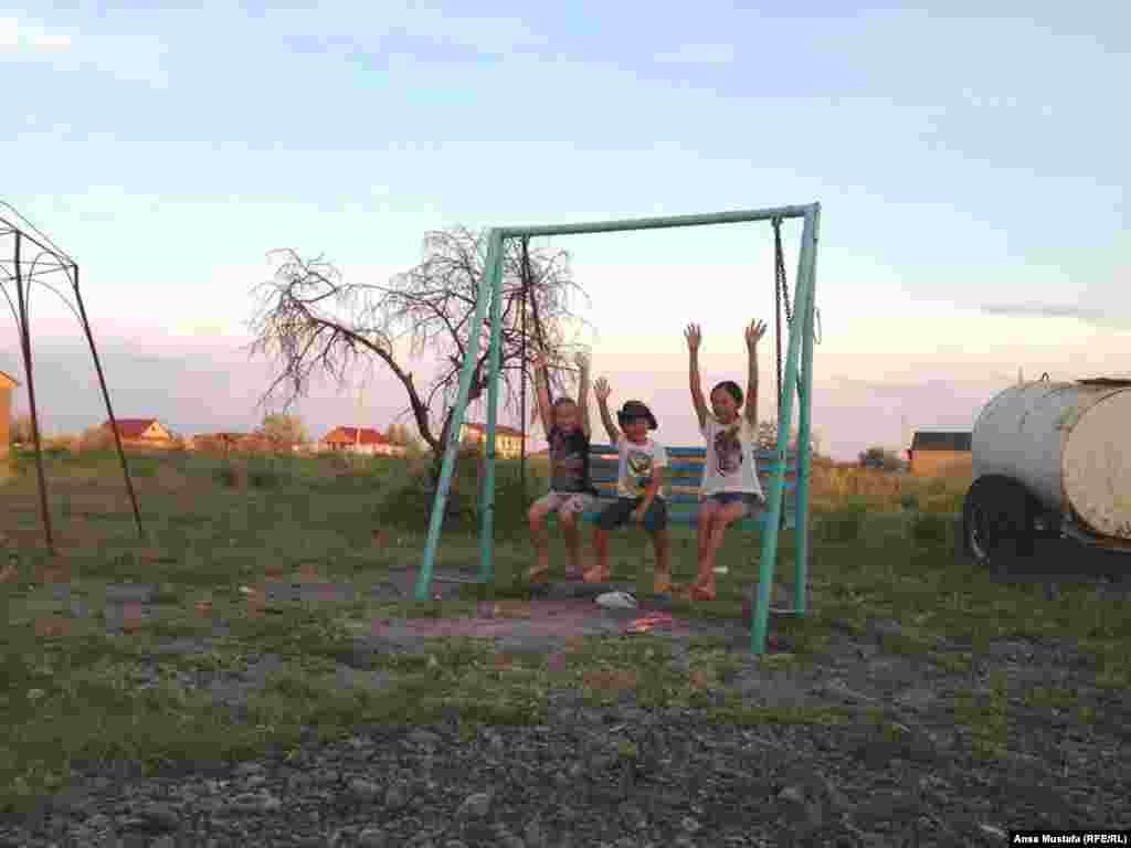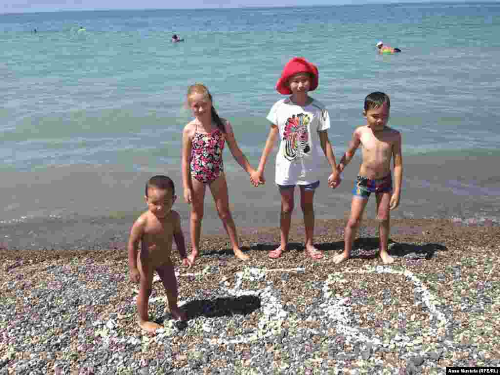 Балалар суға түсіп, жағада тас жинап, жазу жазып ойнап жүр.