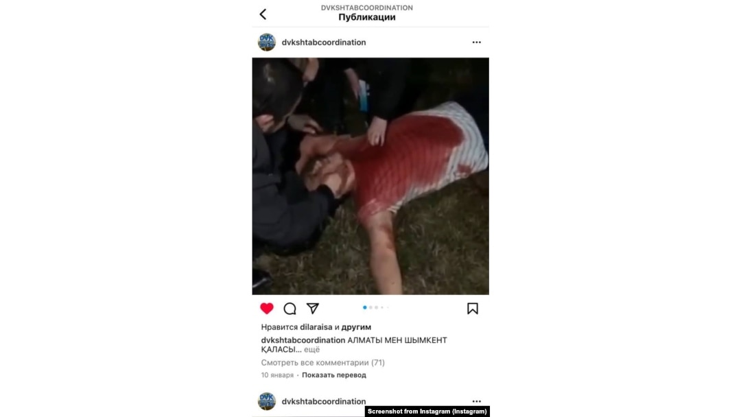 Шымкентте 6 қаңтарға қараған түні жаппай наразылық кезінде оқ тиіп өлімші болып жараланған Бағдад Оңалтаев түсіп қалған видеодан скриншот.